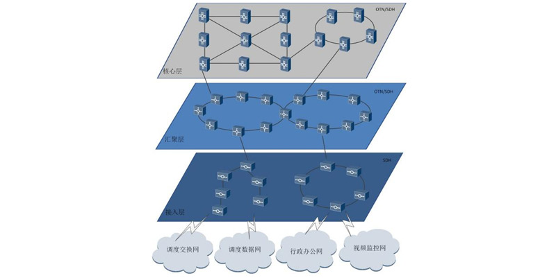 公司的通信系統(tǒng)集成方案采用核心層、匯聚層和接入層三級網(wǎng)絡構(gòu)架,三級網(wǎng)絡主要由OTN、SDH、XPON、CPE等設備部署構(gòu)成,具有承載業(yè)務多樣、網(wǎng)絡結(jié)構(gòu)簡單、網(wǎng)元管理便捷、系統(tǒng)性能穩(wěn)定等特點。